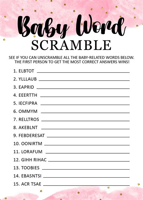 Prepare a list of baby-related words that are scrambled. Divide guests into teams and have them race to unscramble the words. The first team to unscramble all the words correctly wins.